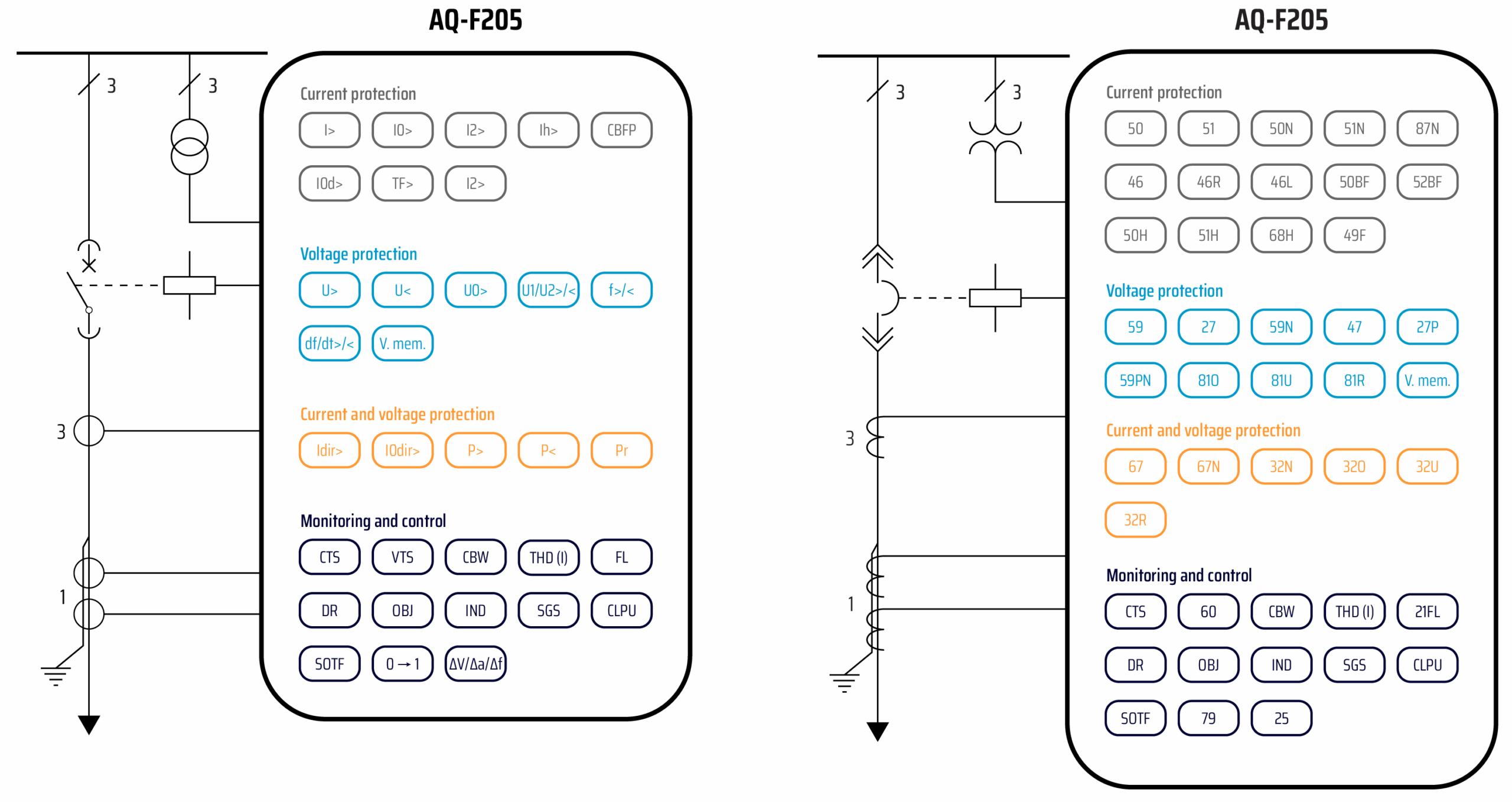 The AQ-F205 feeder protection device is suitable for any application that requires directional overcurrent and earth fault protections along with voltage and frequency protections. The AQ-F205 feeder protection device comes with complementary measurement, monitoring, control and communication features. The relay’s standard configuration of eleven (11) digital inputs and ten (10) digital outputs along with a large, programmable HMI allow for a variety of adaptations.