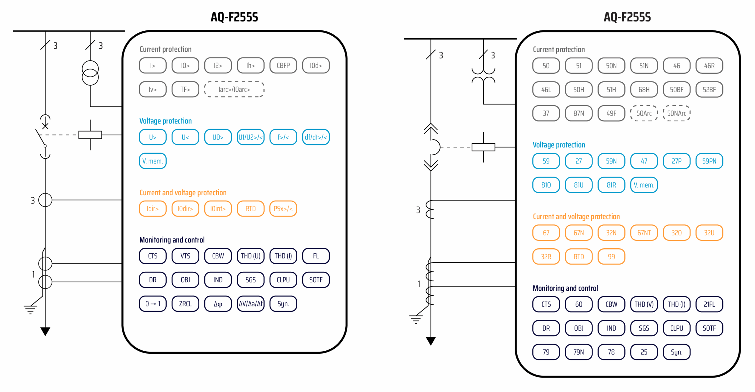 The AQ-F255S feeder protection device offers a modular feeder protection and control solution for applications that require a large I/O capacity and the synchronizer function. You can add up to eleven (11) I/O or communication modules into the device for extensive monitoring and control applications. The AQ-F255S feeder protection device communicates using various protocols, including communication according to the IEC 61850 standard.