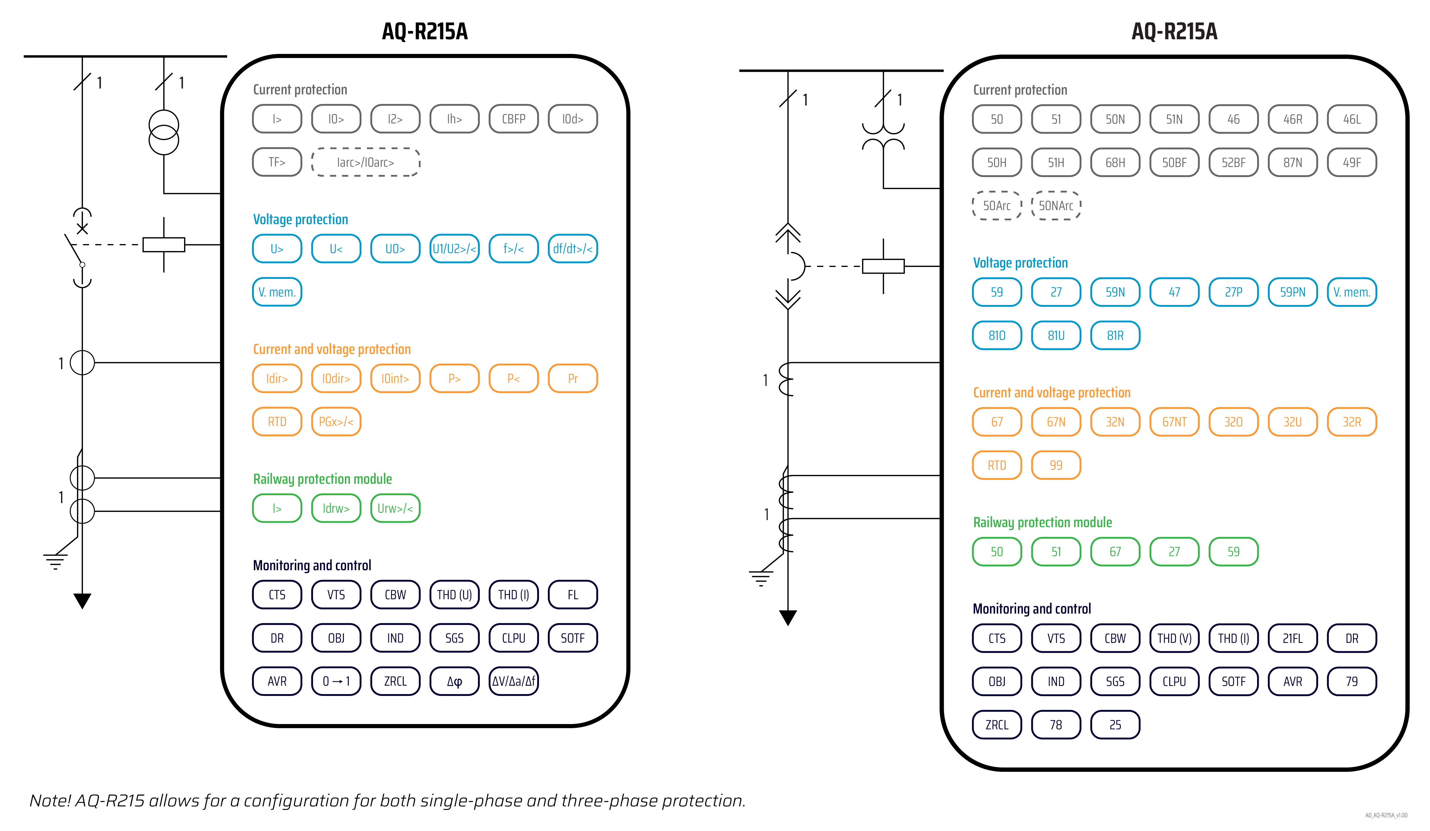 AQ-R215 Railway protection device is a three-phase feeder protection device that can be run either in Standard feeder mode or in Railway mode. In the Railway mode the device provides a single-phase overcurrent, earth fault, and voltage protection. Each protection stage can be independently set to the frequency of 16 2/3 Hz or of 50/60 Hz. When in the Standard mode the functionality of AQ-R215 is identical to that of the AQ-F215 feeder protection device. In this mode the relay can also be dynamically set to run on a frequency between 6 and 75 Hz.
