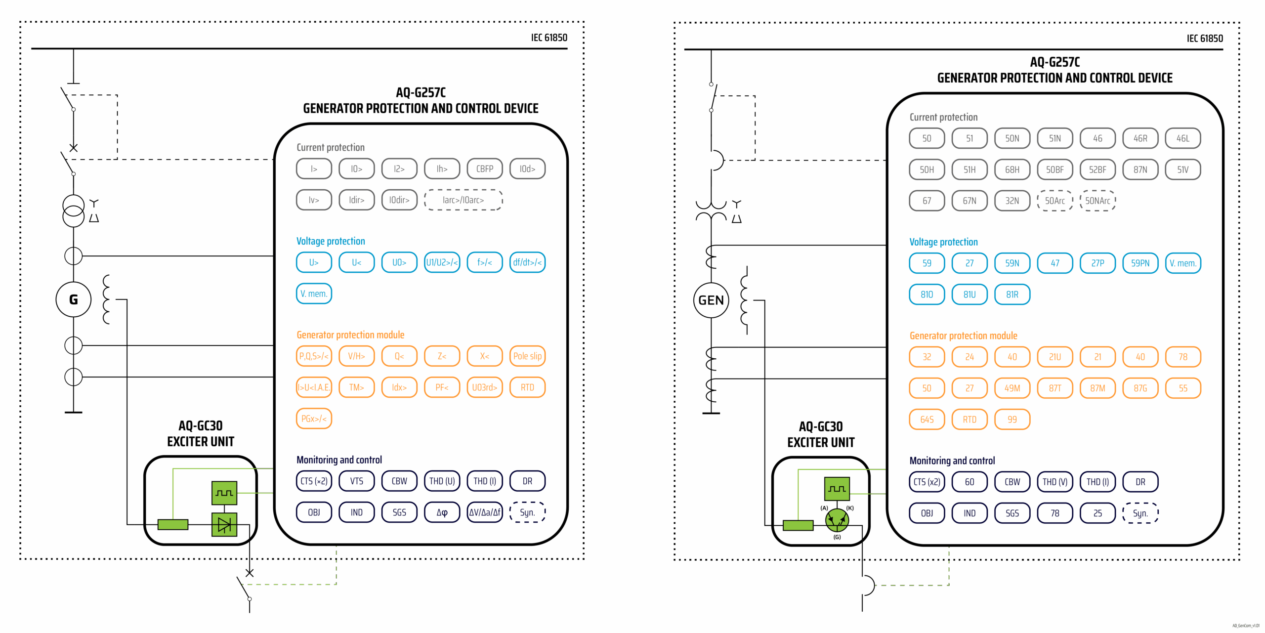 The Generator Commander has four software options for its AQ-G257x unit: the “C” variant (AQ-G257C) includes all the standard protection functions as well as excitation control; the “D” variant (AQ-G257D) also has the power system stabilizer (PSS); the “E” variant (AQ-G257E) has the standard protection functions, excitation control, and the synchronizer function; and the the “F” variant (AQ-G257F) has all the above-mentioned features from standard protection functions to excitation control, power system stabilizer (PSS), and synchronizer. For more details on the software options, please see the order code below.